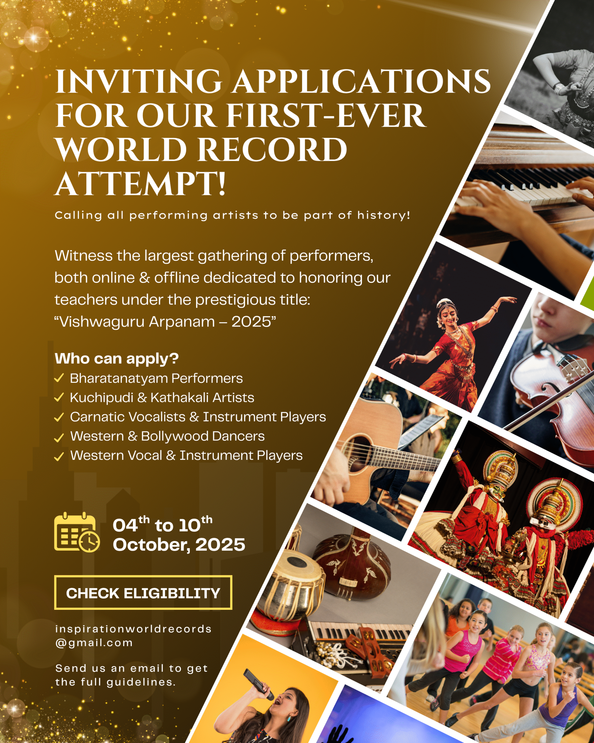 Vishwaguru Arpanam 2025, A Historic Gathering to Honor Our Teachers with 3 Minutes of Non-Stop Artistic Tribute. Record a 3-minute performance without a break, dedicated to your Guru/ Teacher.